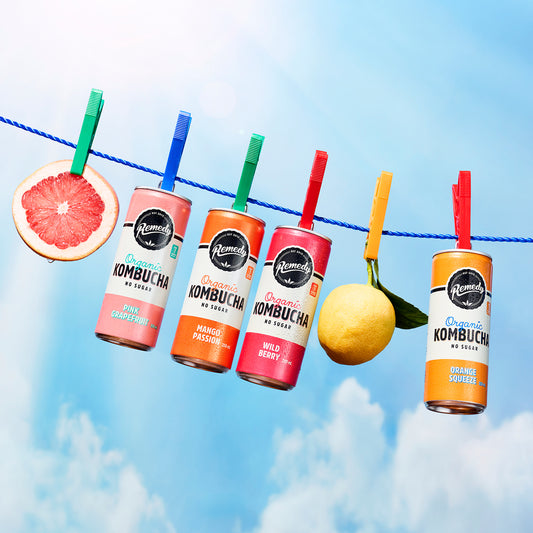 At Remedy Drinks we are obsessed with creating the best darn kombucha (also referred to as booch) going ‘round. We brew the old school way in small batches for 30 days using real, organic tea leaves and a SCOBY, which stands for Symbiotic Culture Of (good) Bacteria and Yeast. The result is a flavourful, all natural, sparkling drink that is packed with live cultures, tea polyphenols (antioxidants) and organic acids. Best of all, it has no sugar, for real. Remedy Kombucha is non-alcoholic and is safe out when kept in or out of the fridge. It is also safe to consume during pregnancy and while breastfeeding. Remedy Drinks are handcrafted and bottled in Melbourne, Australia.
