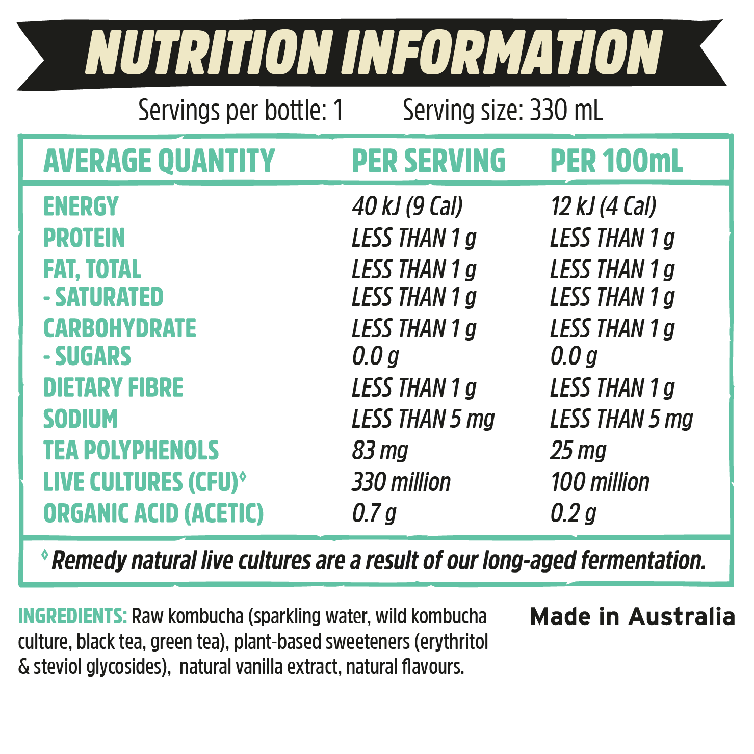 Each serve of Remedy Kombucha has less than 10mg of caffeine, which is very low. To put it into perspective, coffee can contain more than 100mg of caffeine depending on how strongly it is brewed.