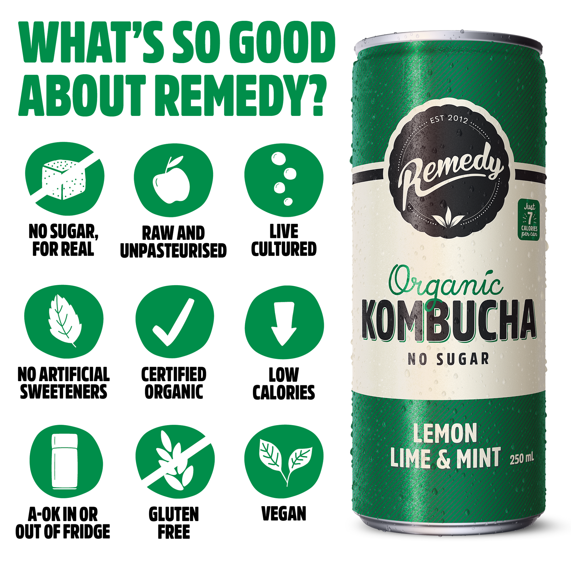 Our kombucha is best served chilled but they are a-ok if they are stored out of the fridge. This is because Remedy Kombucha naturally contains no sugar and our live cultures are super healthy, strong and happy. No sugar means there’s no risk of refermentation. Healthy, strong, happy live cultures mean they stay alive throughout shelf life. It’s a myth that all live cultures need to be refrigerated at all times – fermentation does happen in a warm environment, after all!