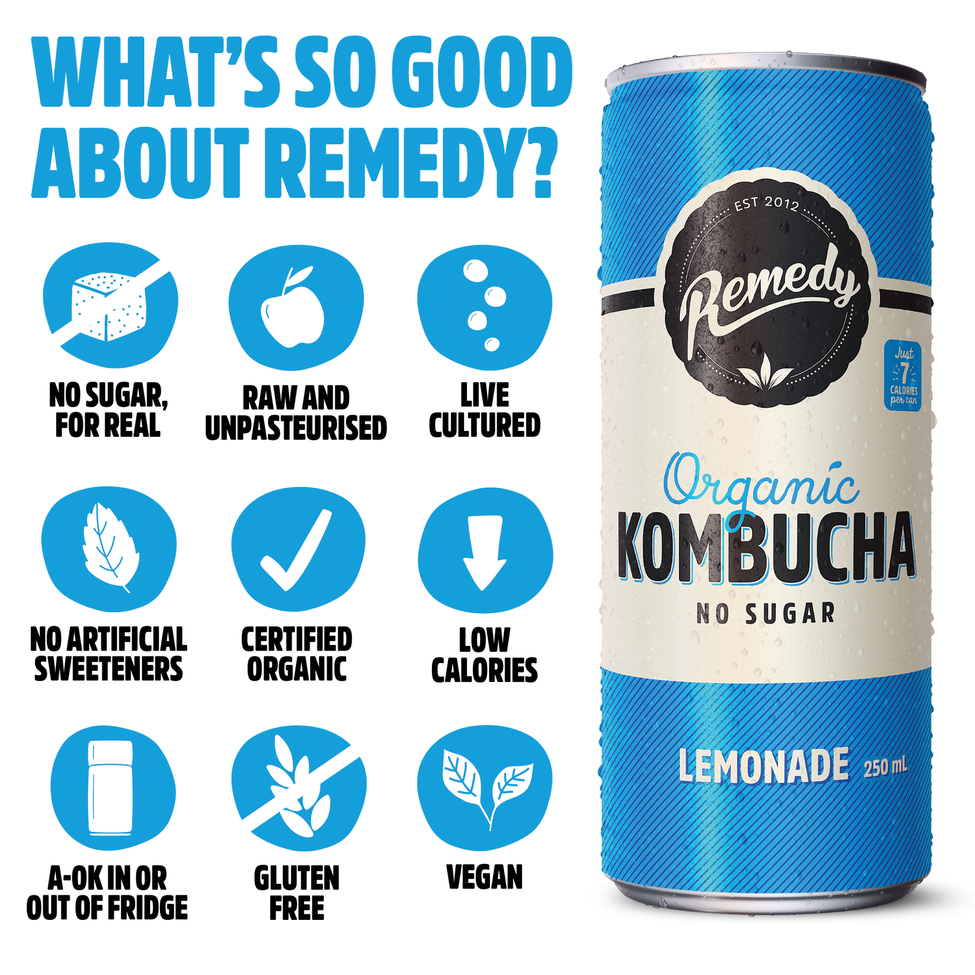 Our kombucha is best served chilled but they are a-ok if they are stored out of the fridge. This is because Remedy Kombucha naturally contains no sugar and our live cultures are super healthy, strong and happy. No sugar means there’s no risk of refermentation. Healthy, strong, happy live cultures mean they stay alive throughout shelf life. It’s a myth that all live cultures need to be refrigerated at all times – fermentation does happen in a warm environment, after all!