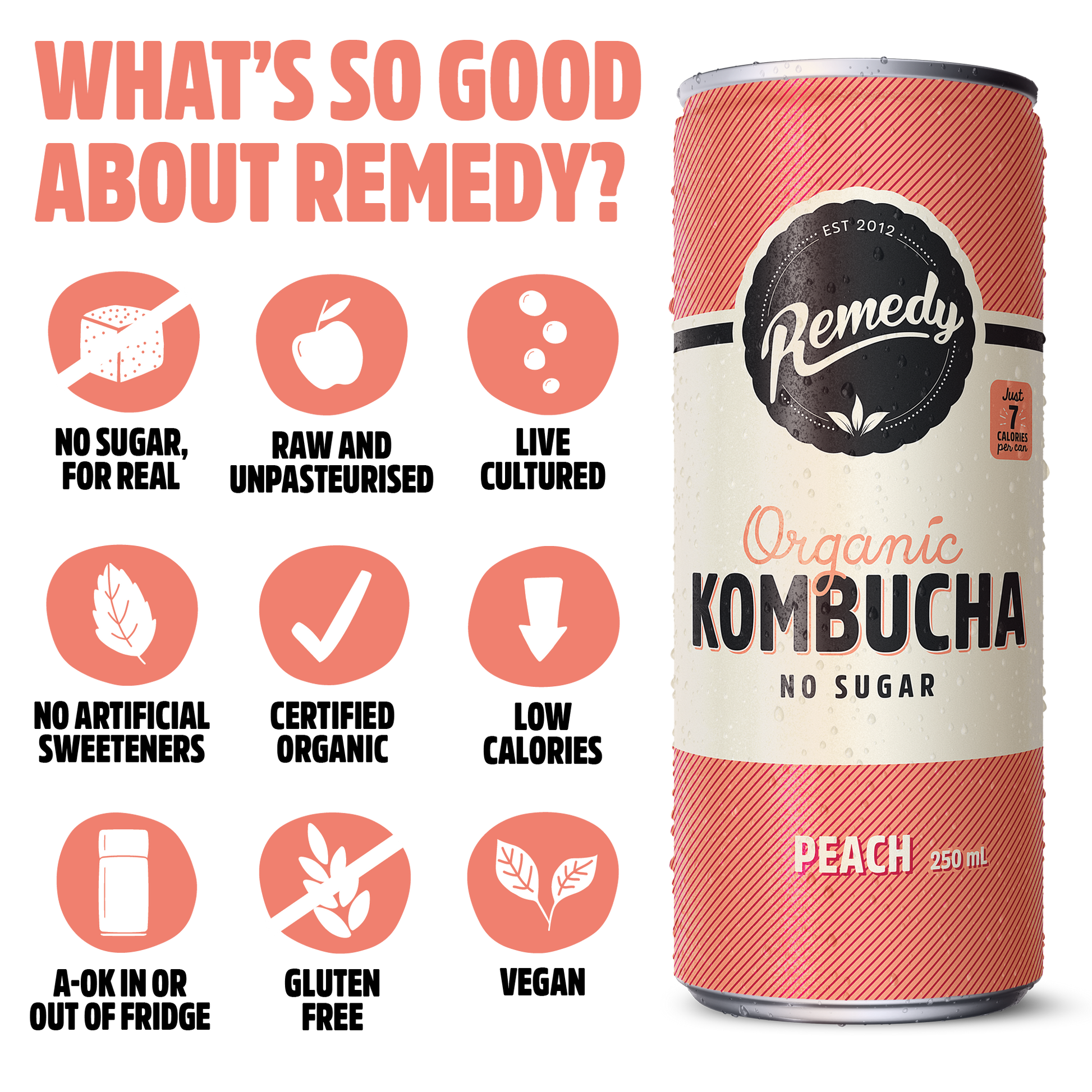 Our kombucha is best served chilled but they are a-ok if they are stored out of the fridge. This is because Remedy Kombucha naturally contains no sugar and our live cultures are super healthy, strong and happy. No sugar means there’s no risk of refermentation. Healthy, strong, happy live cultures mean they stay alive throughout shelf life. It’s a myth that all live cultures need to be refrigerated at all times – fermentation does happen in a warm environment, after all!