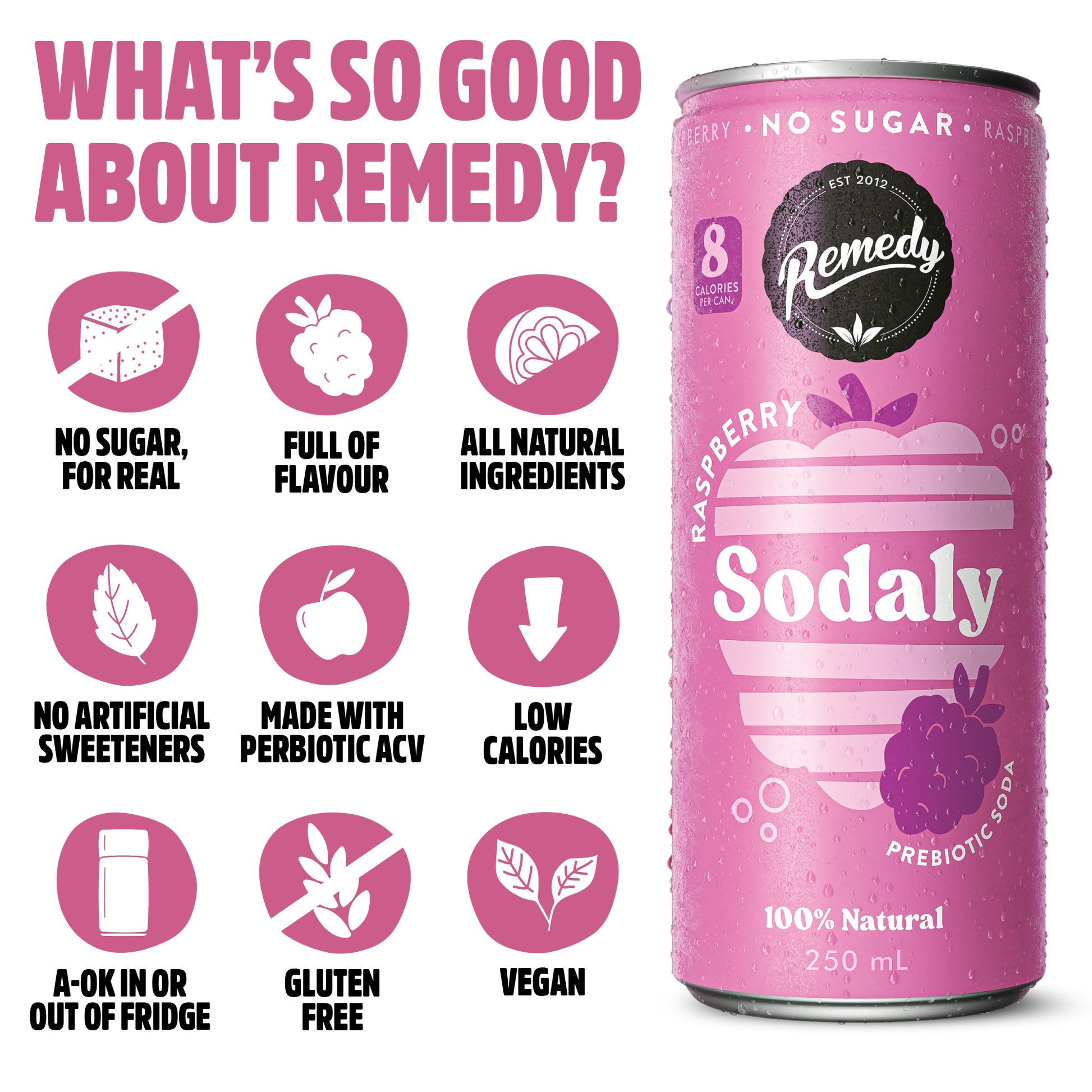 Remedy Sodaly is a great tasting, all-natural prebiotic soft drink that’s big on flavour and low on guilt! Each 250ml can contains no sugar, all natural fruit flavours, a boost of ACV prebiotic goodness and only 8 calories.