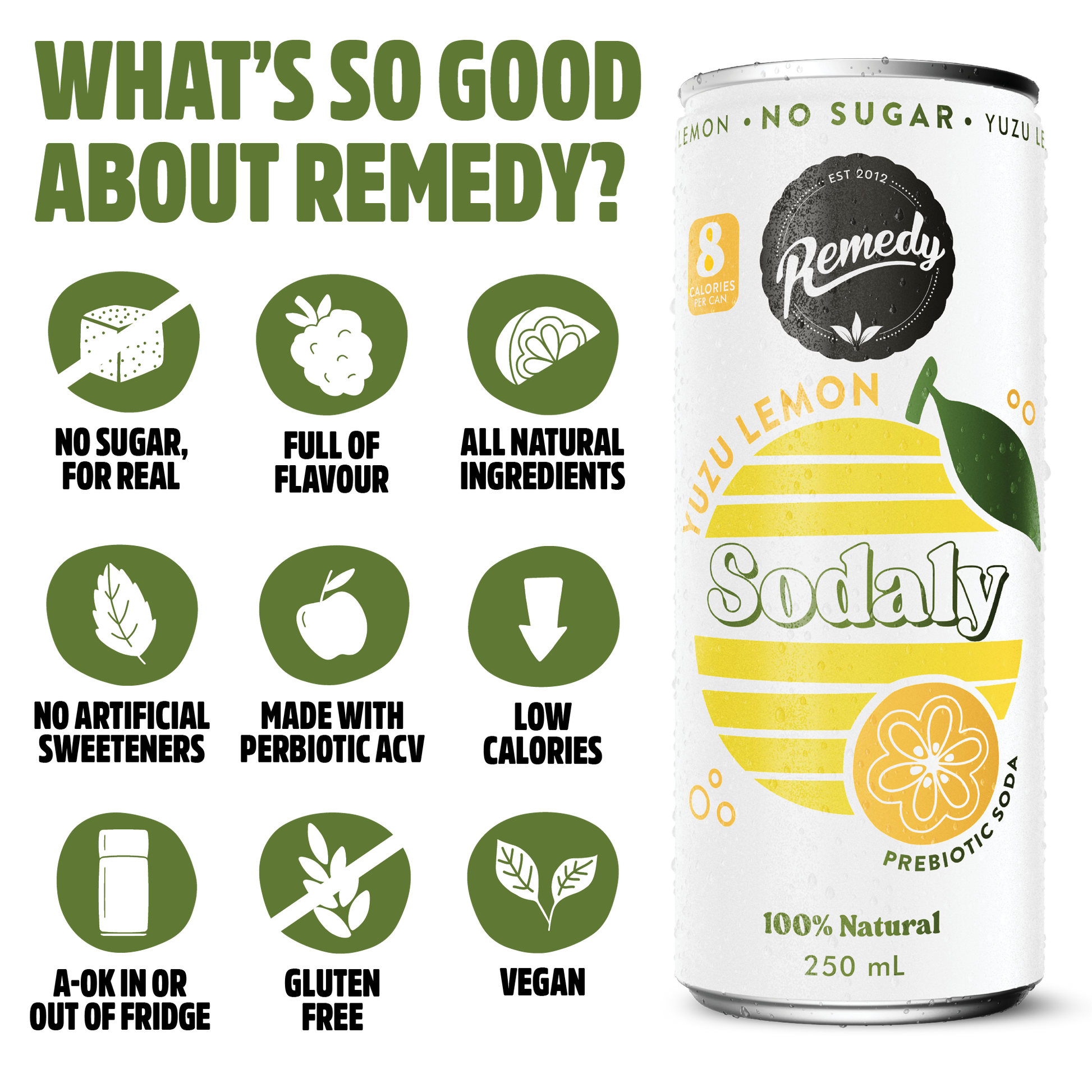 Remedy Sodaly is a great tasting, all-natural prebiotic soft drink that’s big on flavour and low on guilt! Each 250ml can contains no sugar, all natural fruit flavours, a boost of ACV prebiotic goodness and only 8 calories.